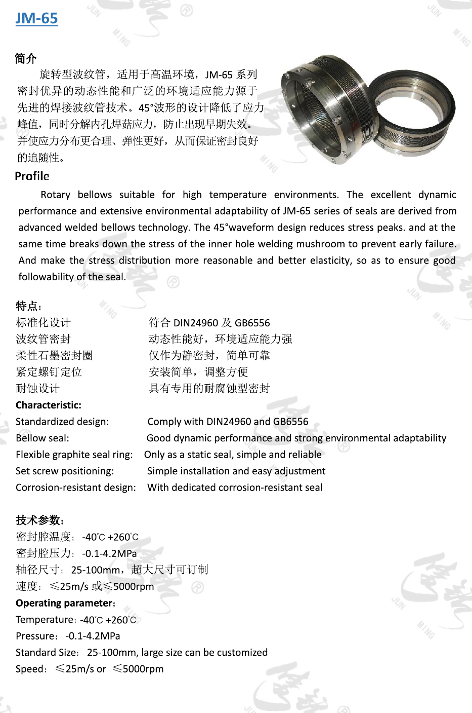 旋轉(zhuǎn)型波紋管,適用于高溫環(huán)境,JM-65系列密封優(yōu)異的動態(tài)性能和廣泛的環(huán)境適應(yīng)能力源于先進(jìn)的焊接波紋管技術(shù)。45°波形的設(shè)計(jì)降低了應(yīng)力峰值,同時(shí)分解內(nèi)孔焊菇應(yīng)力,防止出現(xiàn)早期失效。并使應(yīng)力分布更合理、彈性更好,從而保證密封良好的追隨性。