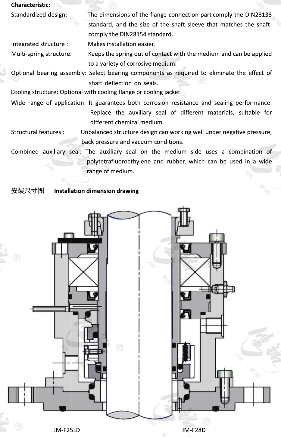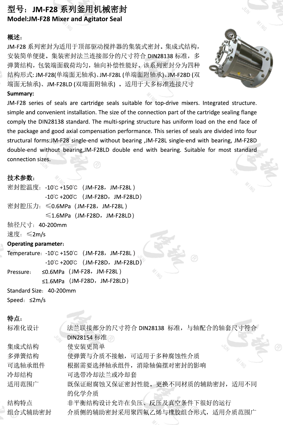 JM-F28系列密封為適用于頂部驅(qū)動(dòng)攪拌器的集裝式密封。集成式結(jié)構(gòu),安裝簡(jiǎn)單便捷。集裝密封法蘭連接部分的尺寸符合DIN28138標(biāo)準(zhǔn),多彈簧結(jié)構(gòu),包裝端面載荷均勻,軸向補(bǔ)償性能好。該系列密封分為四種結(jié)構(gòu)形式: JM-F28(單端面無軸承)、JM-F28L (單端面附軸承)、JM-F28D (雙端面無軸承)、JM-F28LD (雙端面附軸承) 。適用于大多標(biāo)準(zhǔn)連接尺寸