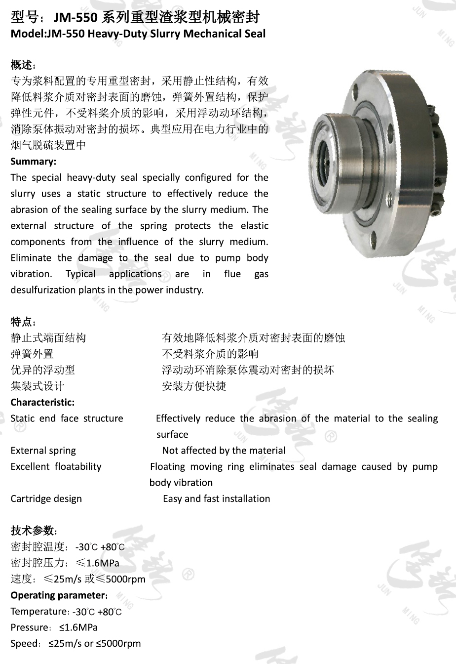 專為漿料配置的專用重型密封,采用靜止性結(jié)構(gòu),有效降低料漿介質(zhì)對(duì)密封表面的磨蝕,彈簧外置結(jié)構(gòu),保護(hù)彈性元件,不受料槳介質(zhì)的影響,采用浮動(dòng)動(dòng)環(huán)結(jié)構(gòu),消除泵體振動(dòng)對(duì)密封的損壞。典型應(yīng)用在電力行業(yè)中的煙氣脫硫裝置中