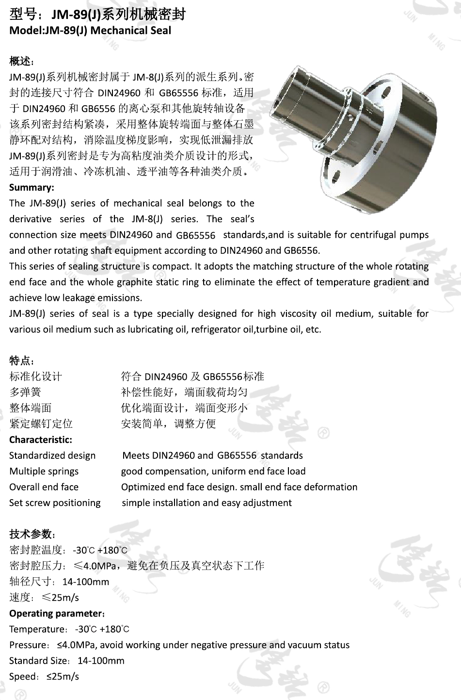 JM-89(J)系列密封是專為高粘度油類介質(zhì)設(shè)計(jì)的形式,適用于潤滑油、冷凍機(jī)油、透平油等各種油類介質(zhì)。