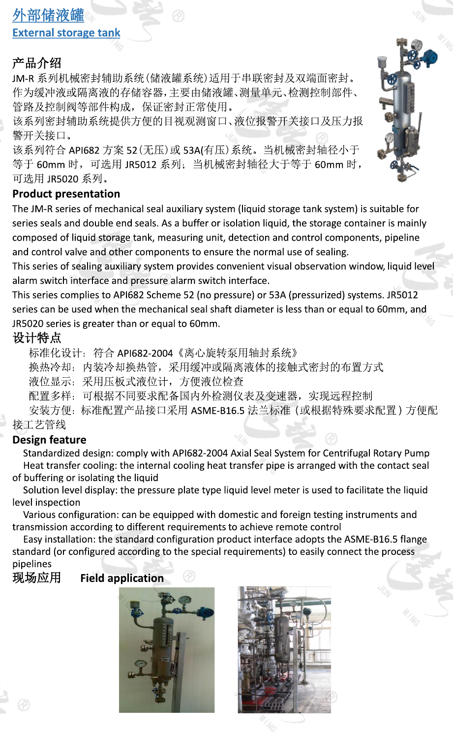 JM-R系列機械密封輔助系統(tǒng)(儲液罐系統(tǒng))適用于串聯(lián)密封及雙端面密封。作為緩沖液或隔離液的存儲容器,主要由儲液罐、測量單元、檢測控制部件、管路及控制閥等部件構成,保證密封正常使用。