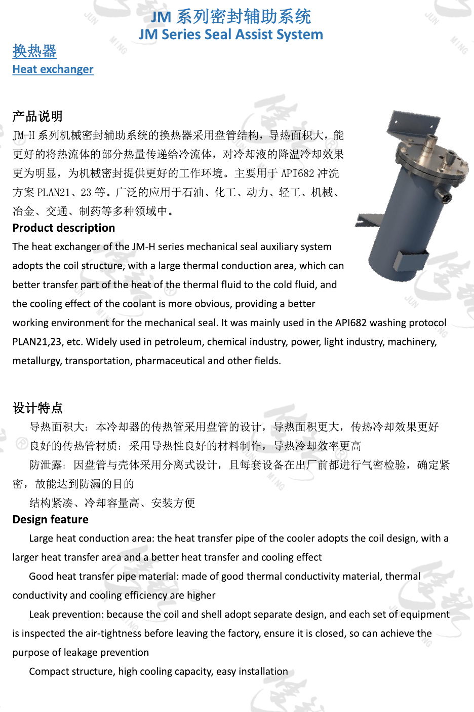 JM-H系列機(jī)械密封輔助系統(tǒng)的換熱器采用盤管結(jié)構(gòu),導(dǎo)熱面積大,能更好的將熱流體的部分熱量傳遞給冷流體,對(duì)冷卻液的降溫冷卻效果更為明顯,為機(jī)械密封提供更好的工作環(huán)境。主要用于API682沖洗方案PLAN21、23等。廣泛的應(yīng)用于石油、化工、動(dòng)力、輕工、機(jī)械、冶金、交通、制藥等多種領(lǐng)域中。
