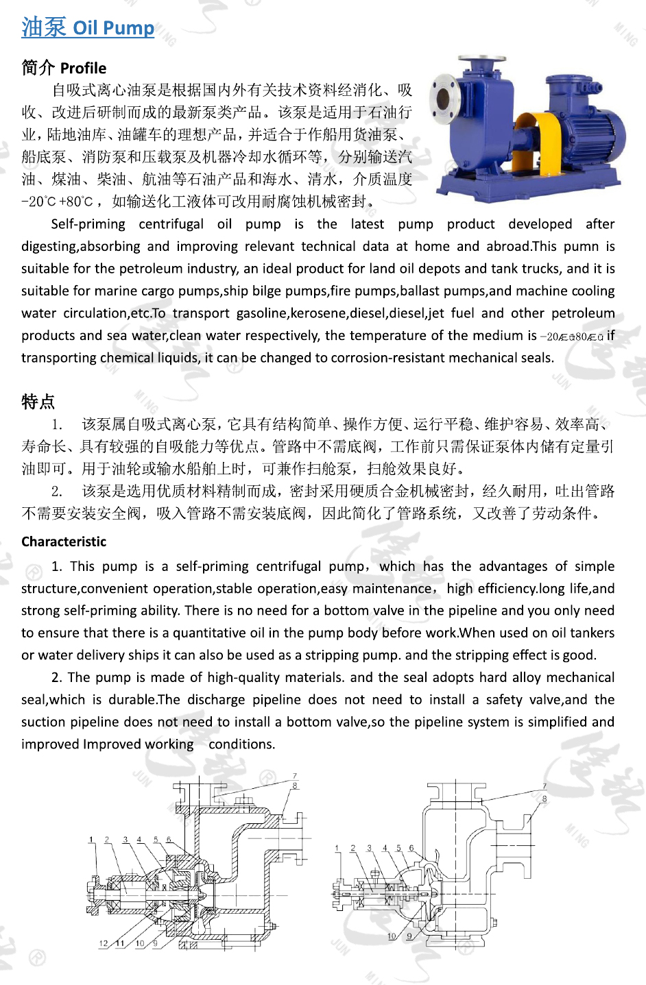 自吸式離心油泵是根據(jù)國內(nèi)外有關(guān)技術(shù)資料經(jīng)消化、吸收、改進后研制而成的最新泵類產(chǎn)品。該泵是適用于石油行業(yè),陸地油庫、油罐車的理想產(chǎn)品,并適合于作船用貨油泵、船底泵、消防泵和壓載泵及機器冷卻水循環(huán)等,分別輸送汽油、煤油、柴油、航油等石油產(chǎn)品和海水、清水,介質(zhì)溫度-20℃+80℃,如輸送化工液體可改用耐腐蝕機械密封。
