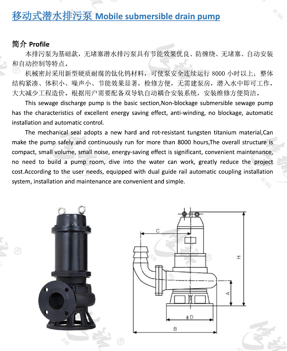 本排污泵為基礎(chǔ)款,無(wú)堵塞潛水排污泵具有節(jié)能效果優(yōu)良、防纏繞、無(wú)堵塞、自動(dòng)安裝和自動(dòng)控制等特點(diǎn)。